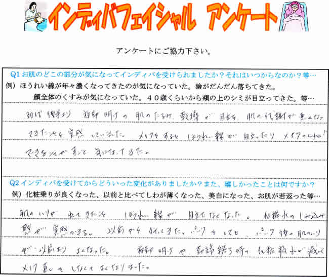続けてみたい方にはインディバフェイシャルなどコースのご案内をすることも可能ですのでご希望の方はおっしゃってください、
